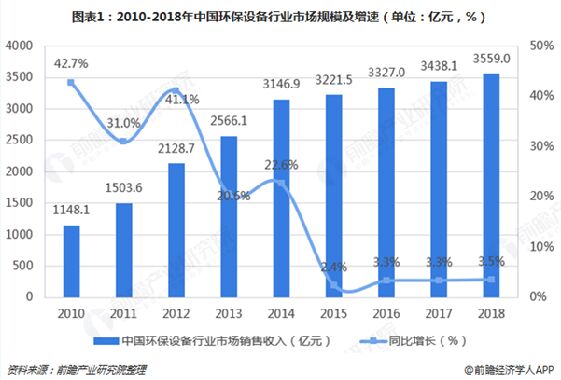 隨著國(guó)民環(huán)保意識(shí)加強(qiáng),加之國(guó)家對(duì)環(huán)保治理等愈加重視,環(huán)保產(chǎn)業(yè)逐漸成為當(dāng)下熱門(mén)的朝陽(yáng)產(chǎn)業(yè)。而作為產(chǎn)業(yè)中重要的分支,環(huán)保設(shè)備行業(yè)是支撐環(huán)保產(chǎn)業(yè)的重中之重。但是,2018年環(huán)保行業(yè)面臨PPP項(xiàng)目擴(kuò)展周期結(jié)束、企業(yè)融資困難等多重難題,直接拖累了環(huán)保設(shè)備行業(yè)的發(fā)展。預(yù)計(jì)經(jīng)過(guò)2018-2019年兩年的調(diào)整期,環(huán)保設(shè)備行業(yè)的發(fā)展將迎來(lái)新的拐點(diǎn),行業(yè)規(guī)模擴(kuò)張速度將有望得到提高。 行業(yè)規(guī)模持續(xù)擴(kuò)張,但增速仍處低位 我國(guó)的環(huán)保設(shè)備行業(yè)起步于20世紀(jì)60年代,經(jīng)過(guò)多年發(fā)展,環(huán)保設(shè)備已成為我國(guó)環(huán)境保護(hù)的重要物質(zhì)基礎(chǔ),在戰(zhàn)略性新興產(chǎn)業(yè)中居于重要位置。目前,我國(guó)環(huán)保設(shè)備在大氣污染治理設(shè)備、水污染治理設(shè)備和固體廢物處理設(shè)備三大領(lǐng)域已經(jīng)形成了一定的規(guī)模和體系。 從市場(chǎng)銷(xiāo)售規(guī)模來(lái)看,2010年至今,中國(guó)環(huán)保設(shè)備行業(yè)市場(chǎng)規(guī)模逐年擴(kuò)張,但是自2015年開(kāi)始,行業(yè)規(guī)模增速明顯放緩。2018年,行業(yè)銷(xiāo)售收入在3559億元左右,同比增長(zhǎng)了3.5%,延續(xù)了行業(yè)低速增長(zhǎng)趨勢(shì)。