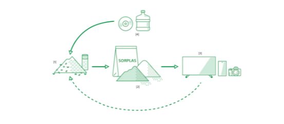 為早日實(shí)現(xiàn)“走向零負(fù)荷”的集團(tuán)環(huán)境目標(biāo),索尼始終致力于開發(fā)環(huán)保材料、提高產(chǎn)品能源使用效率、改進(jìn)包裝設(shè)計(jì)、減少產(chǎn)品中的新塑料使用等。索尼還宣布將在2025年前停止在新設(shè)計(jì)的小型產(chǎn)品上使用塑料包裝且每臺(tái)產(chǎn)品的新塑料使用量減少10%,而SORPLAS的研發(fā)要追溯到約20年前,索尼在推進(jìn)廢水凈化劑、高吸水性材料等廢棄物減量化、高附加值化技術(shù)開發(fā)的同時(shí),發(fā)現(xiàn)了化學(xué)處理(磺化)塑料具有高阻燃性聚碳酸酯,SORPLAS是通過將以這種方式制成的硫磺阻燃劑(PSS-K)添加到回收的聚碳酸酯中制作而成的。SORPLAS的制作流程如下:將廢棄水桶、舊光盤粉碎后混合,再加入PSS-K及其他添加劑溶融混煉,最終造粒制成。