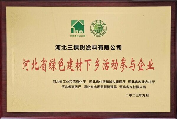 9月20日,由工業(yè)和信息化部、住房和城鄉(xiāng)建設部、農業(yè)農村部、商務部、國家市場監(jiān)督管理總局、國家鄉(xiāng)村振興局組織的2023年全國綠色建材下鄉(xiāng)活動(河北站)啟動儀式在高碑店市召開,三棵樹受邀出席活動,榮獲由河北省工業(yè)和信息化廳,住房和城鄉(xiāng)建設廳等部門聯(lián)合頒發(fā)的首批“參與企業(yè)”授牌,以表彰企業(yè)推動綠色建材行業(yè)發(fā)展的突出貢獻。