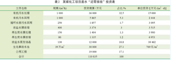 煤化工項目廢水“近零排放”投資大,單位處理規(guī)模投資達(dá)2萬元/(m3 · d),是一般污水處理項目的5倍以上,“近零排放”系統(tǒng)總投資一般占整個項目投資的10%以上,在一定程度上降低了項目競爭力。某煤化工項目廢水“近零排放”系統(tǒng)投資情況如表2 所示。