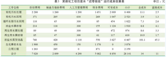 煤化工項目廢水“近零排放”運(yùn)行成本高,單位水處理直接成本高達(dá)11 元/t,全成本34 元/t,如表3所示,遠(yuǎn)高于目前我國新鮮水價,這也是企業(yè)實施“近零排放”積極性不高的主要原因之一。