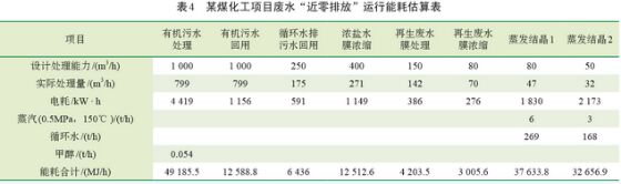 廢水“近零排放”系統(tǒng)能耗高。據(jù)統(tǒng)計,某煤化工項目水處理綜合能耗達(dá)153.7 MJ/t(折合5.2 kg標(biāo)煤),是達(dá)標(biāo)排放情景的6 ~ 10 倍,若采用自然蒸發(fā)模式可降低能耗45%左右,但仍然遠(yuǎn)高于傳統(tǒng)的達(dá)標(biāo)排放模式。某煤化工項目廢水“近零排放”系統(tǒng)運(yùn)行能耗情況如表4 所示。
