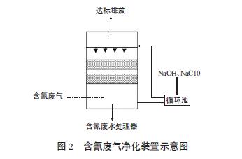 2.2 含氰廢氣凈化處理裝置 氰化鍍槽中的化學(xué)藥品在投加到鍍槽后形成絡(luò)合物溶液,如氰化鍍鋅槽液中的溶液含Na2ZnO2、Na2Zn(CN)4,在電解液中離解為Zn2+ 和CN-,電鍍時(shí),Zn2+ 被陰極吸引,在工件上放電上鍍工件,溶液中的CN- 少量隨鍍槽抽風(fēng)帶入大氣中。在空氣中有二氧化碳存在時(shí),鍍槽內(nèi)存在如下反應(yīng): 2NaCN+H2O+CO2→Na2CO3+2HCN↑ 氰化氫屬于劇毒物質(zhì),不僅對(duì)環(huán)境產(chǎn)生影響,更對(duì)操作人員人身健康造成威脅,要引起足夠重視,一定要及時(shí)妥善處理處置。