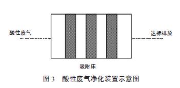 含氰廢氣目前一般采用濕法吸收,吸收液為NaOH、NaClO 溶液(凈化裝置示意見圖2)。反應(yīng)原理如下: CN-+ClO-→CNO-+Cl- . 廢氣通過槽邊吸風(fēng)罩收集后進(jìn)入抽風(fēng)筒,再進(jìn)入廢氣凈化器,與設(shè)置在凈化器內(nèi)的噴淋液充分接觸反應(yīng),凈化后的氣體經(jīng)風(fēng)機(jī)達(dá)標(biāo)排放。噴淋液酸堿值須保持在10 以上,在噴淋液循環(huán)使用過程中,要對(duì)酸堿值每天監(jiān)測(cè),定期配備新的噴淋液,失效的噴淋液排入含氰廢水管道,送入廢水處理站進(jìn)行進(jìn)一步處理。 2.3 其它酸性廢氣凈化裝置 酸性廢氣的凈化處理常用液體吸收法和干式吸附法。液體吸收法是通過噴淋吸收,處理率能達(dá)到90%,但該方法產(chǎn)生的污水存在二次污染,廢水還需要進(jìn)一步處理,且需要專人操作。相比較液體吸收法,干式吸附法目前在企業(yè)中應(yīng)用更加廣泛,某單位新研制的吸附材料對(duì)硫酸霧、氯化氫、氮氧化物、氫氟酸等廢氣就有很好的凈化效果,對(duì)混合酸廢氣亦可凈化。該吸附劑對(duì)廢氣的凈化是一個(gè)多功能的綜合作用,除了物理吸附外,還有化學(xué)吸附、粒子吸附、催化作用等。吸附劑主要成分為鈣的堿性氧化物、硅的氧化物、鋁的氧化物和活性碳(凈化裝置示意見圖3)。