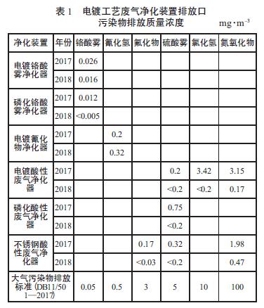 酸性廢氣通過凈化裝置中的干式吸附劑吸附床,酸霧被吸附劑吸附并發(fā)生化學(xué)反應(yīng),酸性氣體被轉(zhuǎn)化為鈣鹽,堿性氣體最終被轉(zhuǎn)化為氮?dú),凈化后的氣體經(jīng)風(fēng)機(jī)達(dá)標(biāo)排放。酸性吸附劑在吸收酸前呈弱堿性,吸附飽和后形成的無害鈣鹽被固定在吸附劑結(jié)構(gòu)中,不需要再生,吸附飽和后的廢棄吸附劑的pH 值和游離氟離子經(jīng)過了國(guó)家環(huán)保監(jiān)測(cè)中心的檢測(cè),對(duì)環(huán)境無二次污染。 3 應(yīng)用案例 某大型國(guó)有企業(yè)電鍍車間,有鍍鉻、氰化鍍鋅、氰化鍍銅、鍍鎳、不銹鋼酸洗等工序,生產(chǎn)過程中產(chǎn)生鉻酸霧、氰化物、氟化氫、硫酸霧、氯化氫、氮氧化物等污染物。車間安裝了2 套鉻酸霧凈化裝置、1套氰化物凈化裝置和3 套酸性廢氣凈化裝置,其中酸性廢氣凈化裝置采用干式吸附法。運(yùn)行2 年后,經(jīng)現(xiàn)場(chǎng)采樣監(jiān)測(cè),廢氣中的鉻酸霧、氰化物、氟化氫、硫酸霧、氯化氫、氮氧化物等污染物全部滿足北京市大氣污染物排放標(biāo)準(zhǔn)(DB11/501———2017)。車間對(duì)廢氣處理設(shè)施定期維修保養(yǎng),并請(qǐng)有資質(zhì)的監(jiān)測(cè)單位對(duì)各個(gè)廢氣排放口定期監(jiān)測(cè),及時(shí)掌握廢氣排放狀態(tài),杜絕廢氣未達(dá)標(biāo)排放(近兩年監(jiān)測(cè)數(shù)據(jù)如表1 所示)。