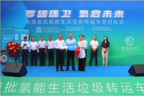 深圳市發(fā)展改革委綠色發(fā)展處處長陳琨,深圳市城管局環(huán)境衛(wèi)生管理處黨委副書記、二級調(diào)研員袁宏偉,深圳能源集團(tuán)股份有限公司副總裁孫川,深圳能源環(huán)保股份有限公司董事長李倬舸,深圳市氫藍(lán)時(shí)代動力科技有限公司董事、常務(wù)副總裁曹桂軍,深圳市氫能與燃料電池協(xié)會秘書長張祎瑩等領(lǐng)導(dǎo)共同見證了新車“鑰匙”交付儀式。