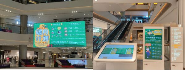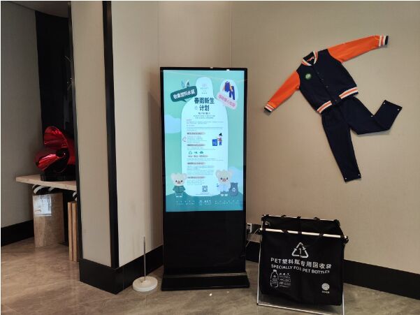 商場內(nèi)外電子大屏、商場內(nèi)水牌、線上小程序都大大地突出了春雨新生的回收塑料瓶做校服的主題傳播。