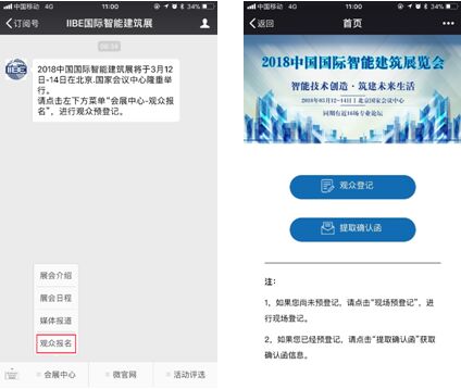 點(diǎn)擊“觀眾報名”或回復(fù)“參觀/報名/預(yù)約登記”,按提示即可進(jìn)入“觀眾登記”通道進(jìn)行預(yù)登記;